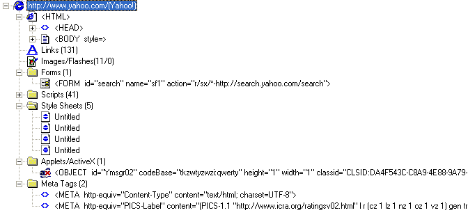 details on forms, meta tags, links, images, scripts, style sheets, applets,